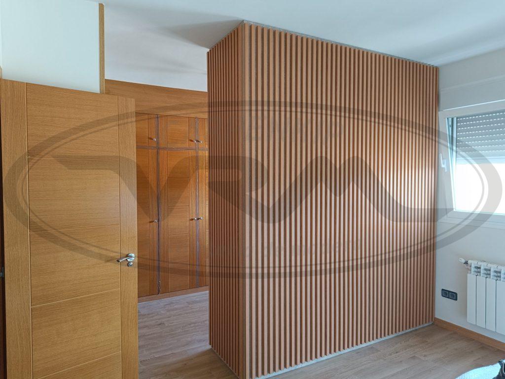 Armario igualando existentes, frente roble barnizado. Puertas con largueros verticales y plafón horizontal
