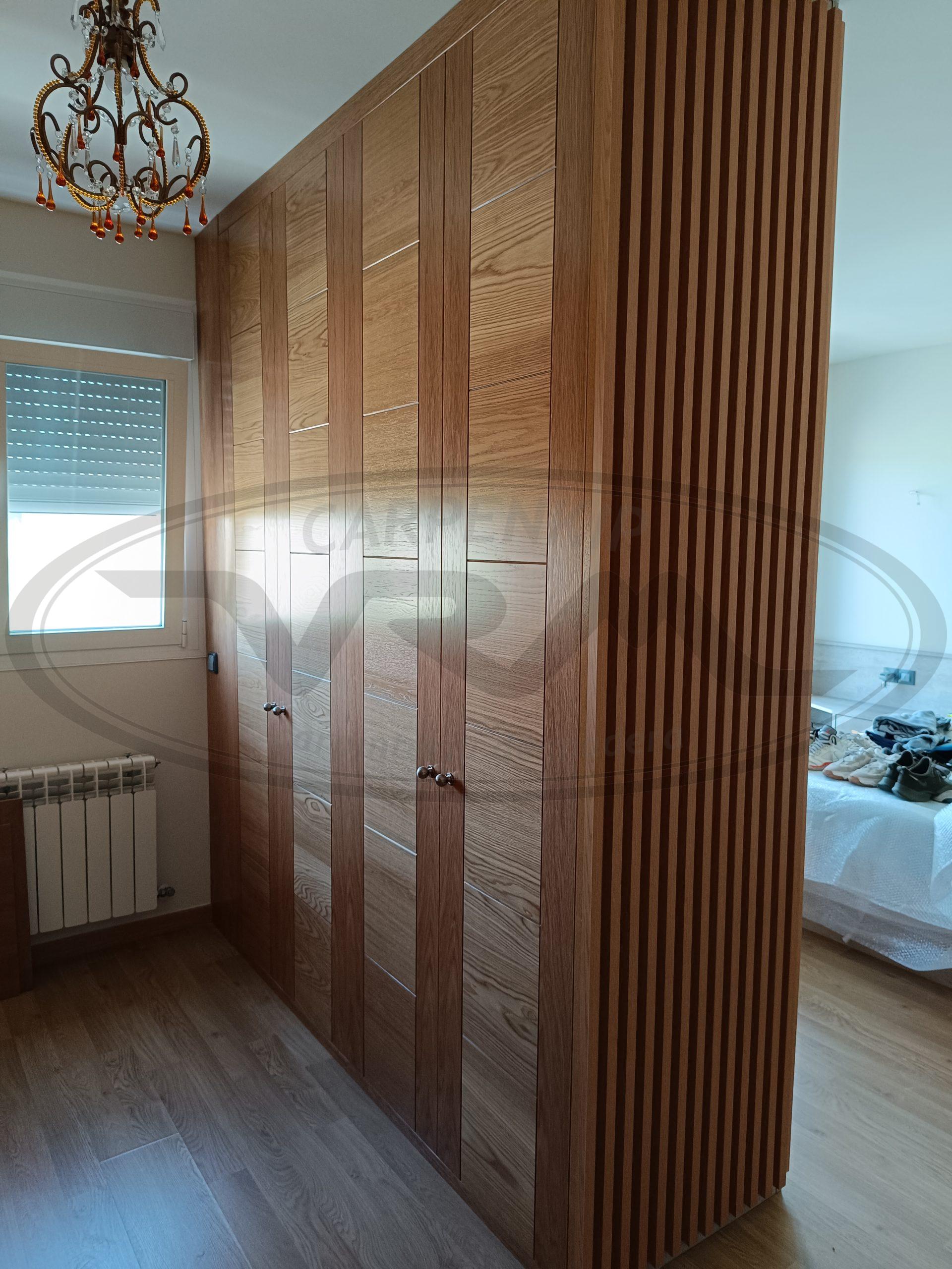 Armario igualando existentes, frente roble barnizado. Puertas con largueros verticales y plafón horizontal