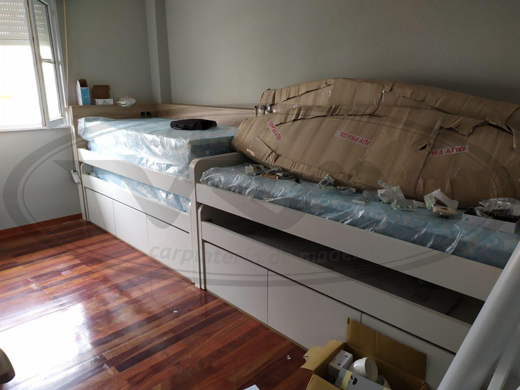 Amublamiento dormitorio, con forrado de pared aislante acústico. Paneles melamina roble con veta cruzada. Parte baja cama un cajones extraíbles de gran capacidad