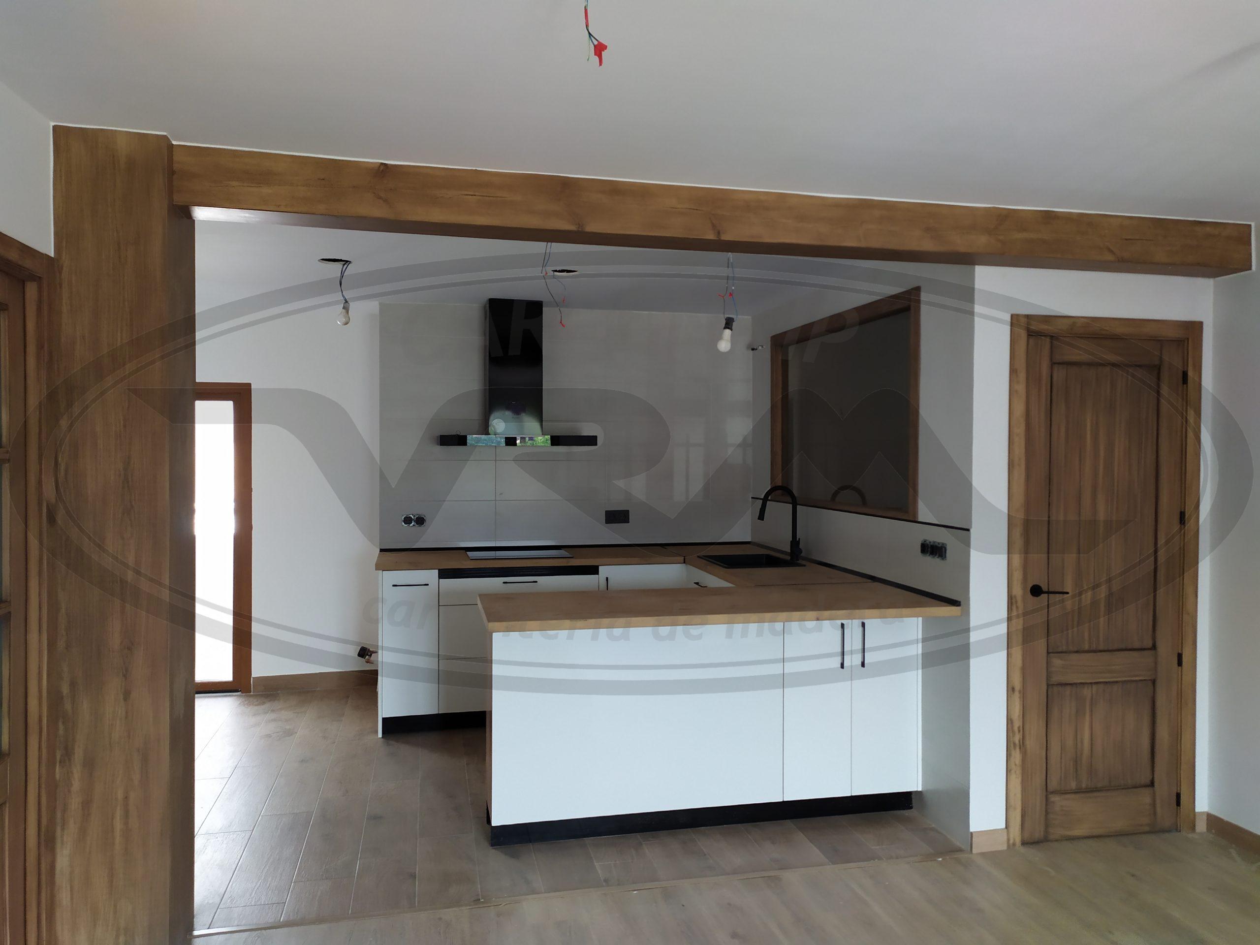 Mobiliario de cocina laminado blanco con tiradores copetes y zócalos negro. Encimeras laminado madera