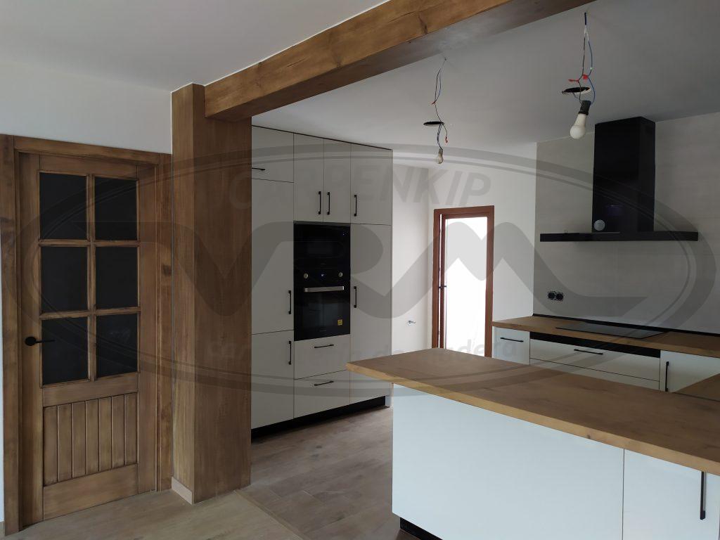 Con viga y columna forradas en madera en mismo color que las puertas de paso