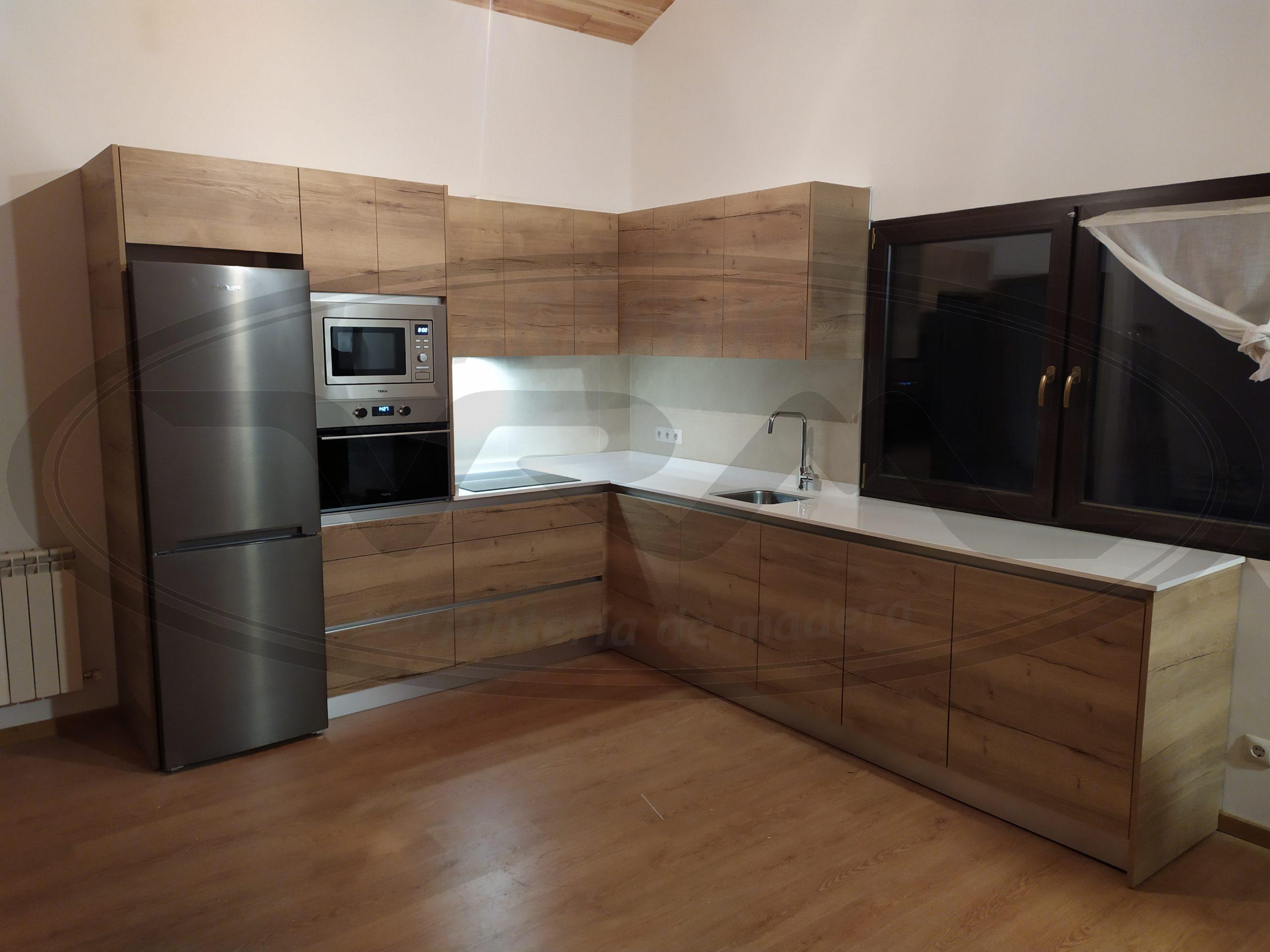 Publicado el por adminCocina perfil gola Mobiliario de cocina con frentes laminado madera veta horizontal sin tiradores. Perfil gola aluminio. Integración de lavadora y lavavajillas y encimera Compac Absolute Blanc