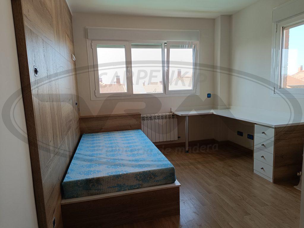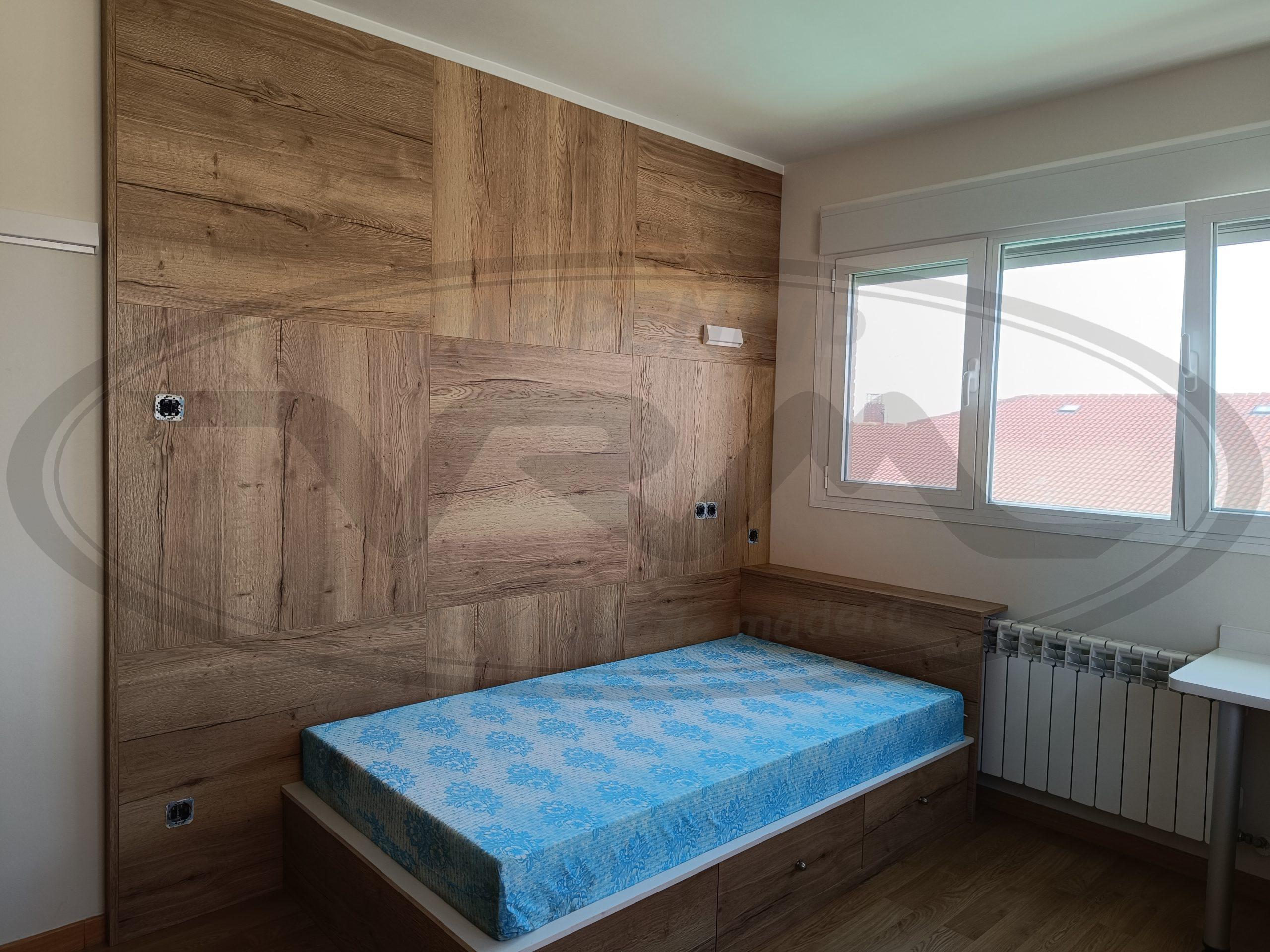 Publicado el por adminDormitorio Juvenil Amublamiento dormitorio, con forrado de pared aislante acústico. Paneles melamina roble con veta cruzada. Parte baja cama un cajones extraíbles de gran capacidad Mesa y cajonera en melamina blanco