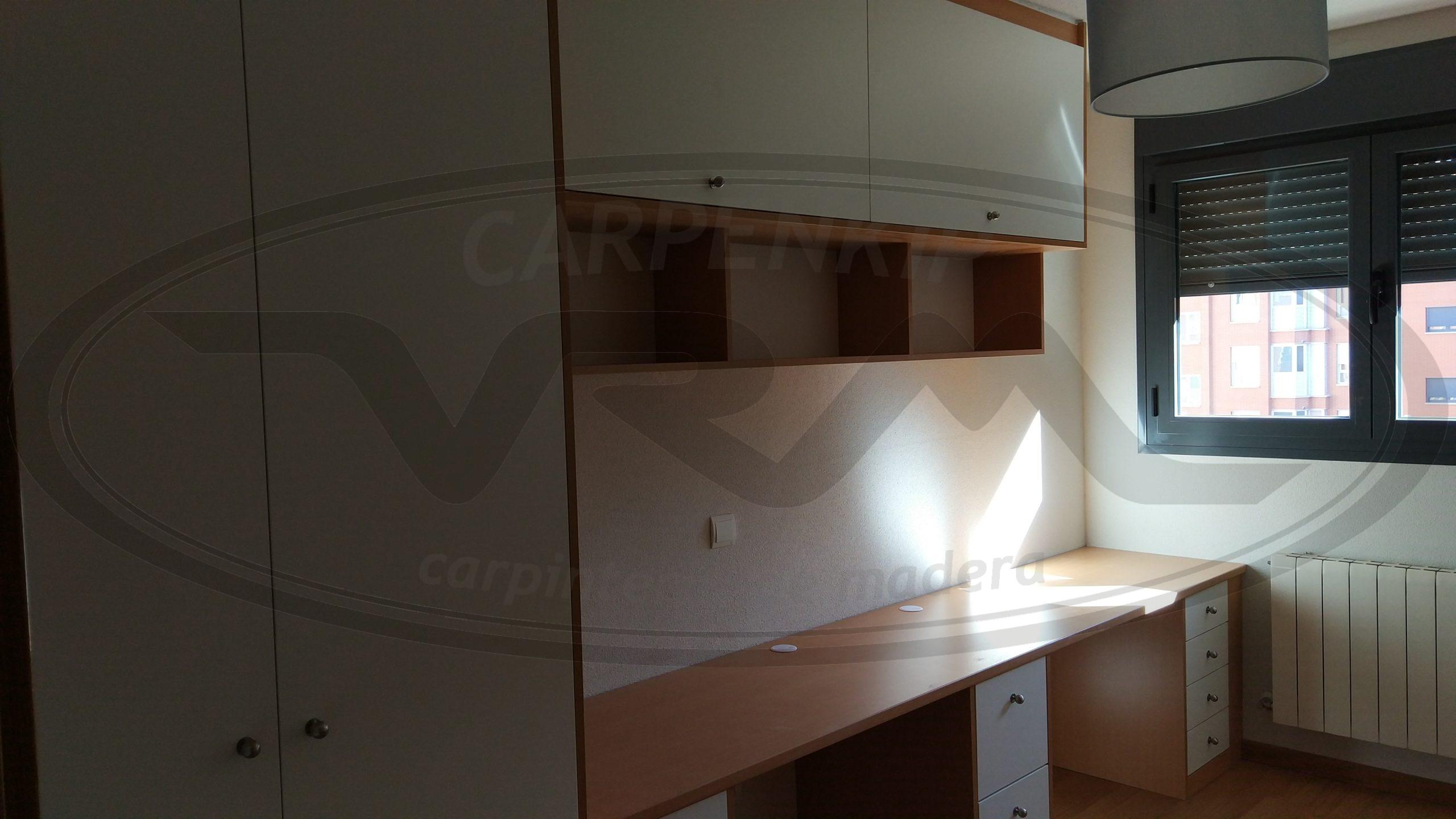 Amueblamiento melamina combinado colores con mesa de trabajo, cajones, estanterías y armario